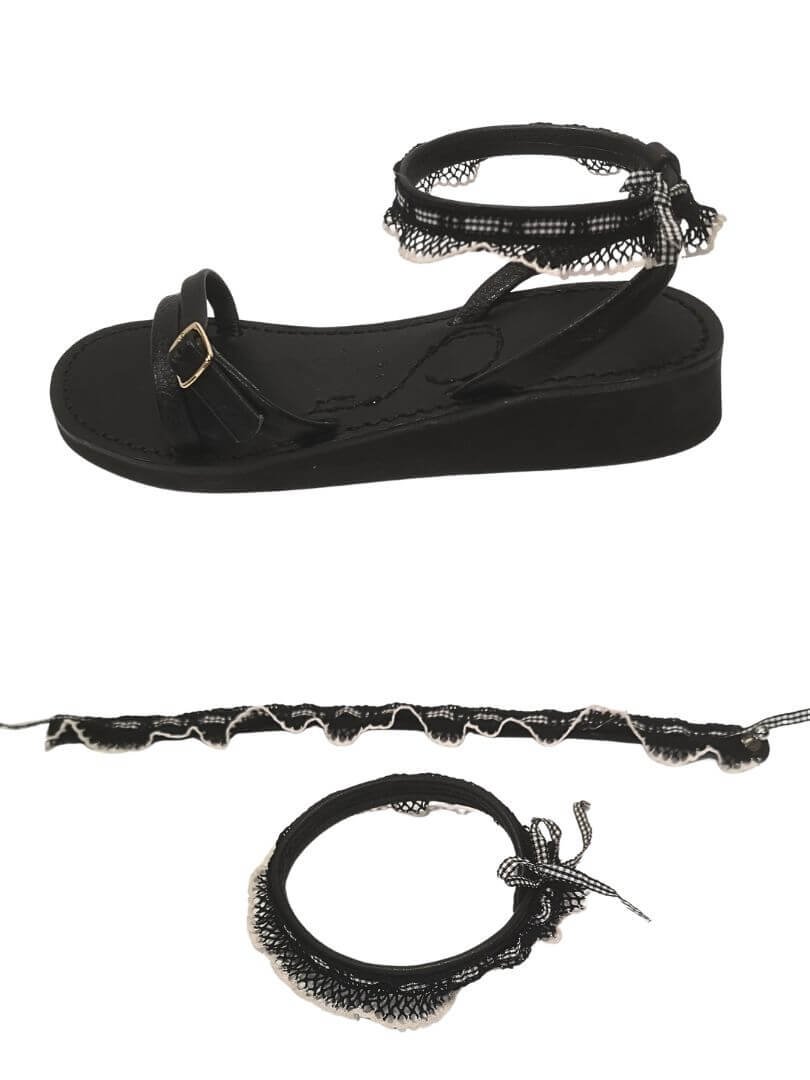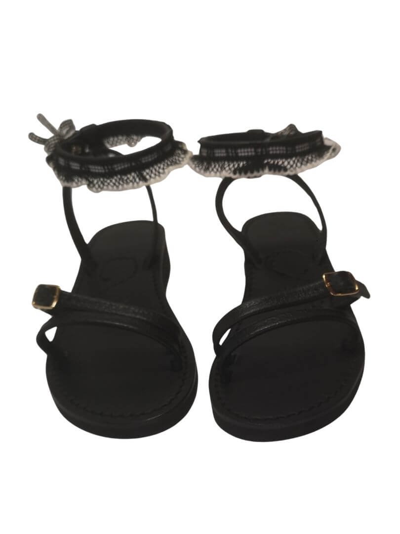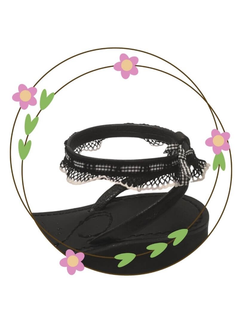 Accessoire en tissu résille cousue sur cuir noir pour personnaliser vos sandales Rosa, avec son joli mini ruban noir et blanc à nouer à votre cheville.