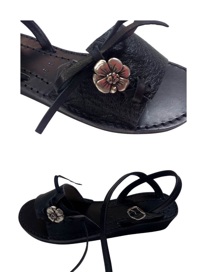 Les sangles sont en cuir de Buffle noir de la tannerie Basque Carriat. Je désépaissi et replie sur lui même ce cuir pour en faire des sangles au rendu élégant et habillé. Solide et confortable, ce cuir accompagne très bien le mouvement du pied tout en conservant sa beauté dans le temps. Le laçage de type “corset” sur l’avant pied se régle pour que vous puissiez l’ajuster au mieux à l’épaisseur de votre pied, pour un pied bien tenu sans serrer et une démarche au top.